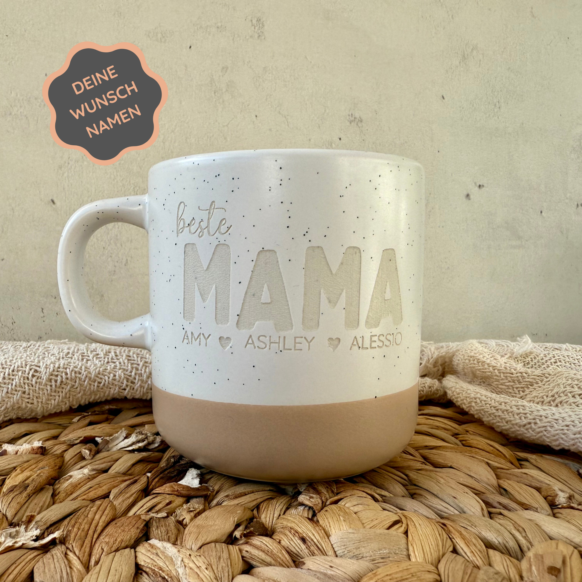 Diese stilvolle Steinguttasse mit beidseitiger Gravur ist das ideale Geschenk für besondere Anlässe wie Geburtstage, Weihnachten, Muttertag oder einfach als liebevolle Geste zwischendurch. Mit deinem Wunschname und einem zarten Herzmotiv wird sie zu etwas ganz Persönlichem.